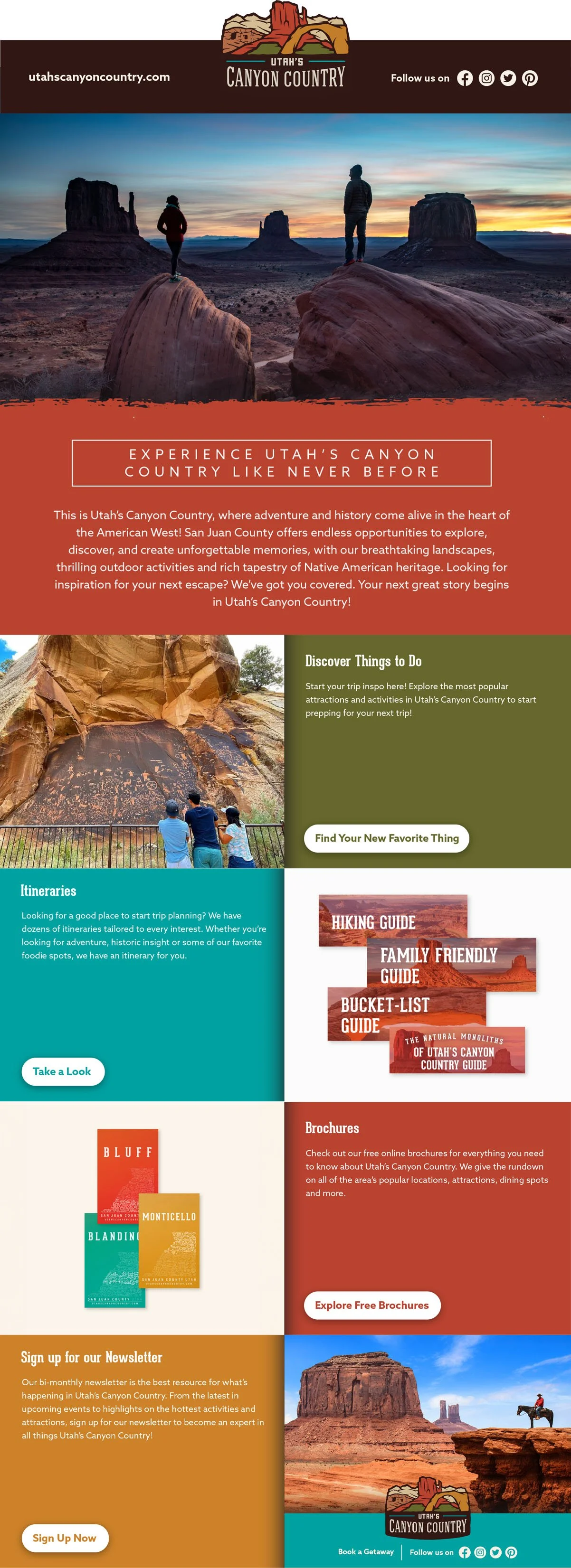 I’ve lost track of how many marketing emails I’ve designed over the last handful of years, but it has to be well over a hundred, largely in the tourism space for our DMO clients working within their existing brand identities to create a welcome response email when prospective visitors requested visitor guides and travel information, and before that designing the monthly newsletter for our company’s in-house travel agency. Emails were largely created across a variety of platforms including all the usual suspects - Constant Contact, Mailjet, Mailchimp and Flodesk. Below are just a handful of emails from this time period, a snapshot of this work, because, frankly, I never was great about documenting these.