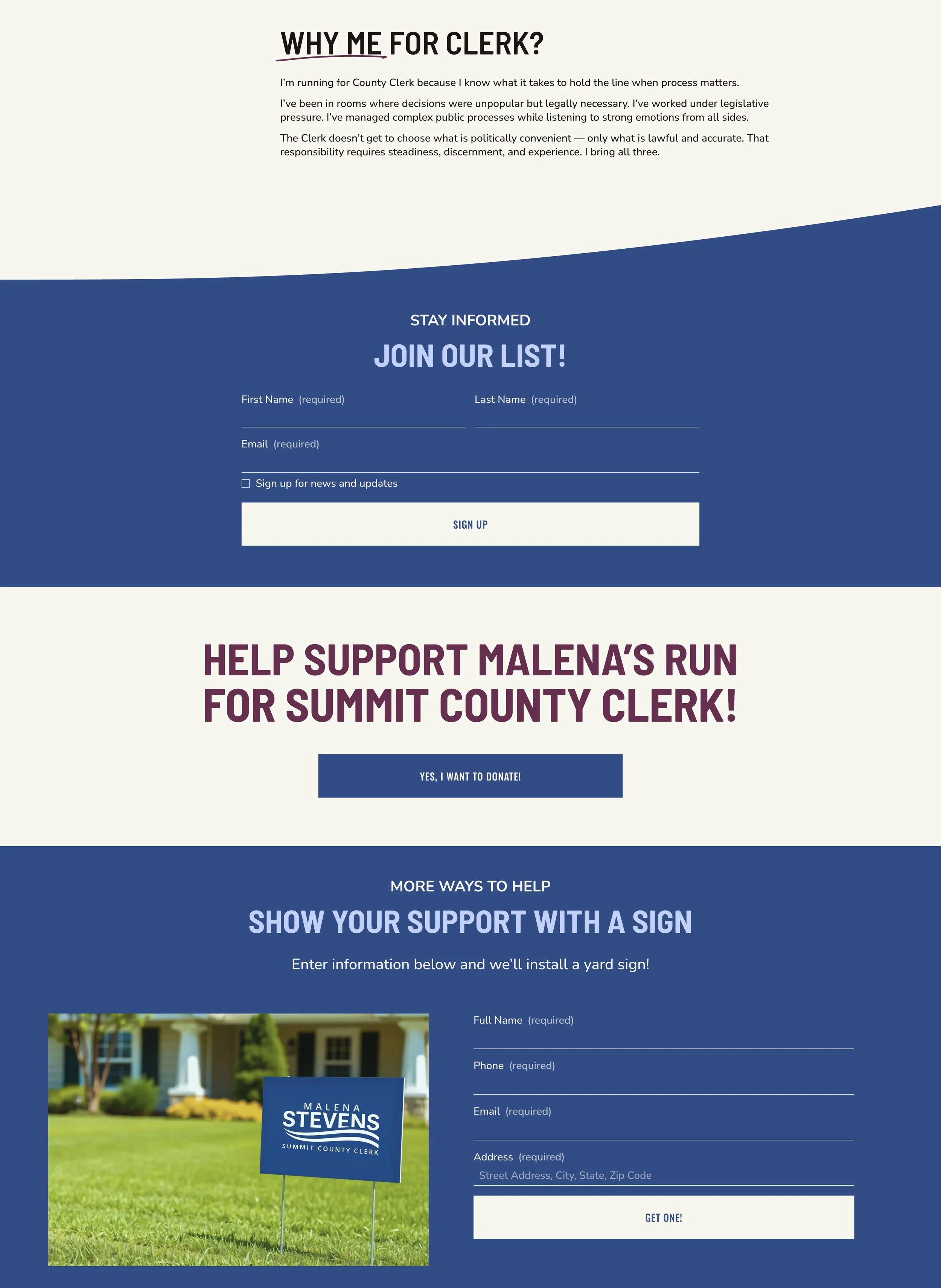 Getting asked to design and build a political campaign website was a first for me, but I love a new opportunity and challenge. Malena had a logo and a domain and not much else, and the goal was to get a site up and running within the week.